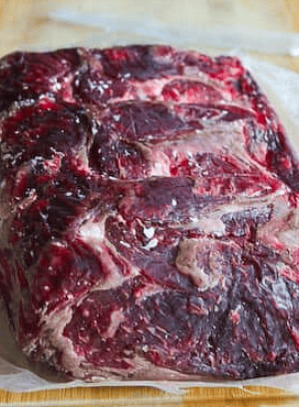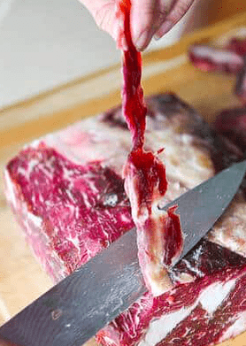 If you are dry ageing a whole cut of meat for steaks, then when it's ready it will look something like this. The meat will have a crust, or pellicle, which is hard and this needs to be trimmed off.